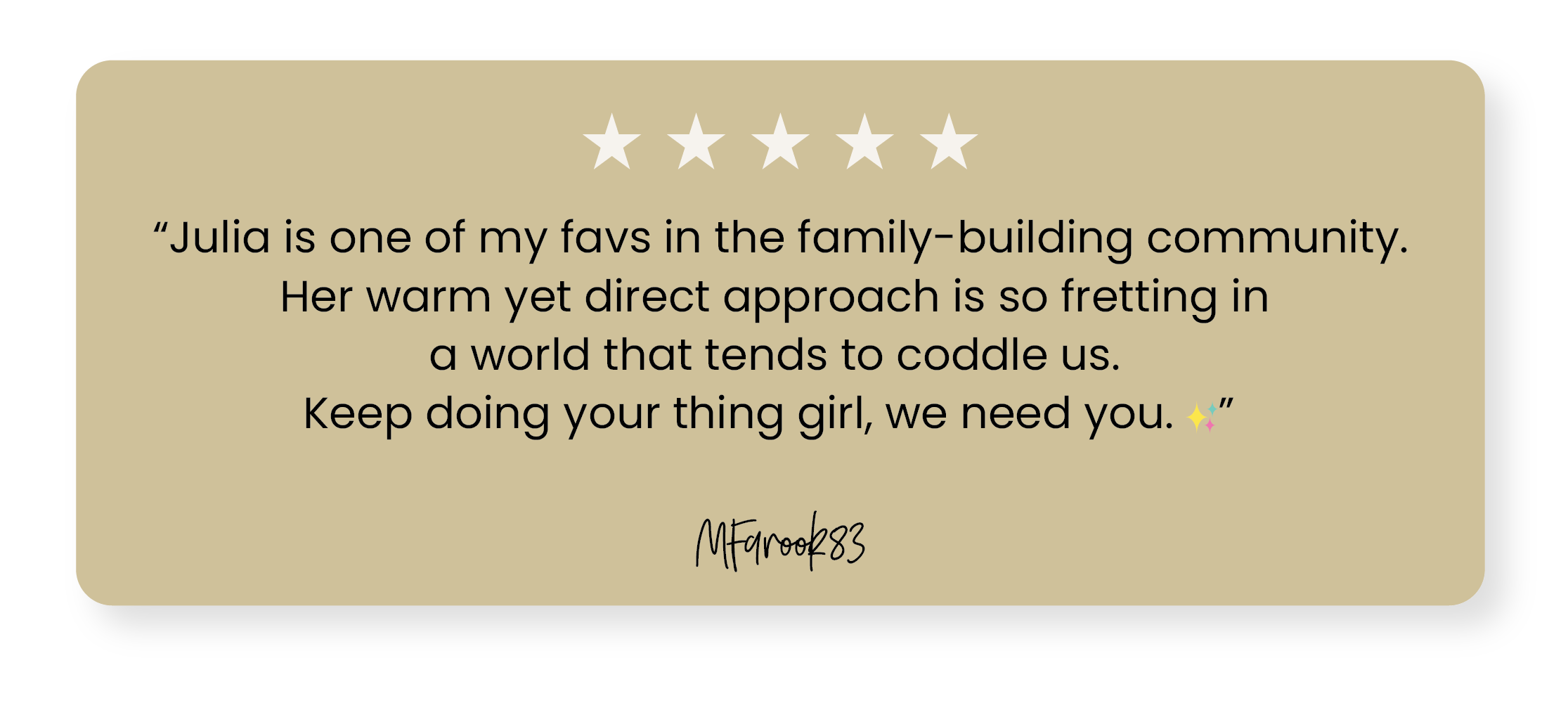 Hi, I’m Julia - and I’m a solo parent by choice (and still expanding my family) and I’m passionate about sharing the stories behind all the ways we build family, and what we can do when things happen differently than the fairytale we’re told we “should” have.